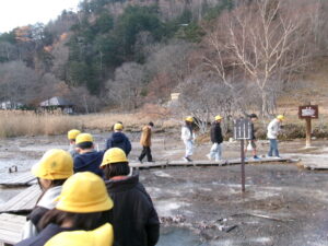 その後は、近くの源泉を見学しました。硫黄のにおいがして少し苦手だなと思った子もいましたが、さわってみてその熱さを感じたり、途中でシカを発見したりと、いろんな体験ができました。