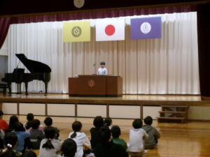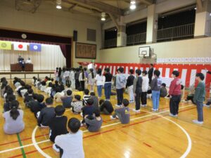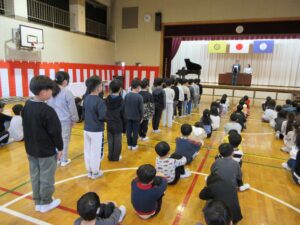 1年間の学びが修了し、それぞれの学年代表の児童が修了証をしっかりと受け取り、全員で一礼をしました。子供たちは立派な態度で式に臨んでいて、大きく成長した姿を見ることが出来ました。